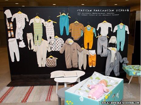 Le mamme possono scegliere tra il pacco maternità, o una sovvenzione diretta in denaro, ora fissata a 140 euro, ma il 95% preferisce la scatola di cartone, vale molto di più.
