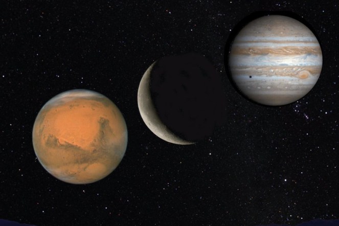 La Luna, Marte e Giove saranno estremamente vicini, almeno per noi che osserviamo dalla Terra. Un po’ più distante, a chiudere a fila, ci sarà Saturno.