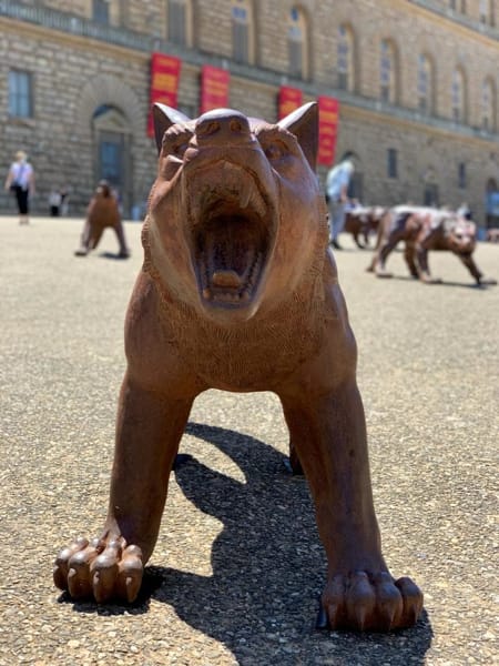 La monumentale installazione, dal nome “I lupi in arrivo”, è possibile grazie alla collaborazione tra il Comune di Firenze e le Gallerie degli Uffizi visibile dal 13 luglio e fino al 2 novembre.