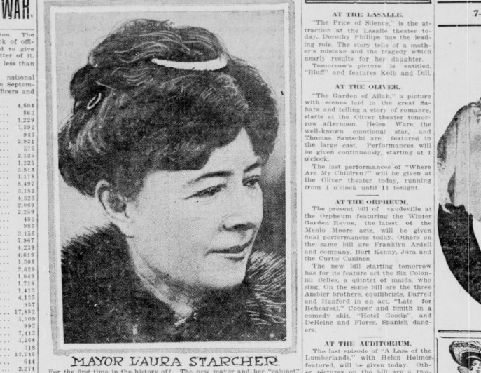 Dopo essere entrata in carica nel gennaio 1917,Laura Stochton Starcher e le altre quattro donne elette al consiglio comunale – Gladys Spinning, Anna Means, Florence Brownell e Stella Paulu – inaugurarono un programma di azione progressista.