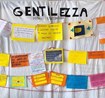 Inoltre hanno usato un lenzuolo bianco dove al centro hanno scritto: “GENTILEZZA MAGIA CONTAGIOSA“. Nel restante spazio sono stati attaccati dei fili di lana colorata, ai quali sono state pinzate moltissime frasi significative riportate su alcuni cartoncini colorati.