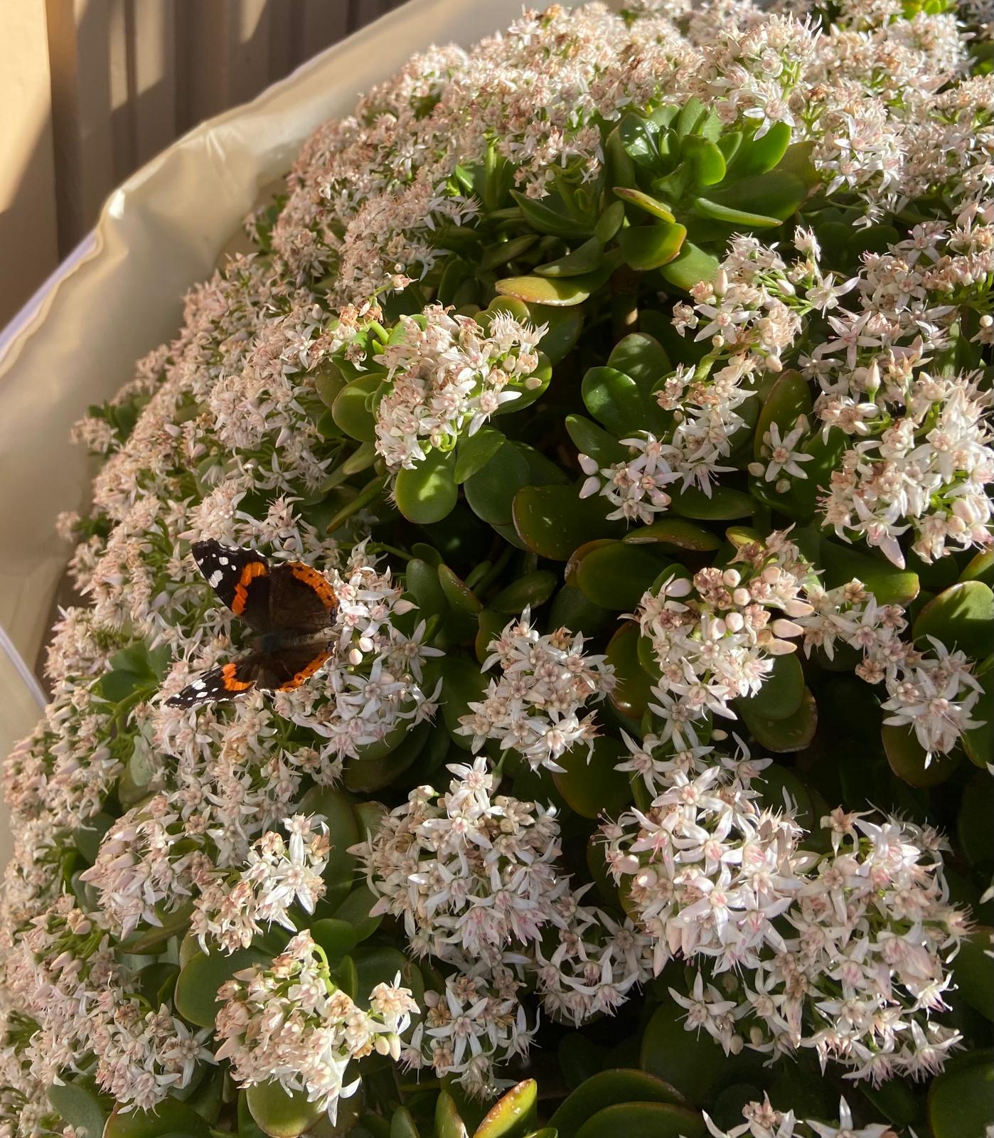 Una farfalla stamattina si è posata sulla mia crassula ovata in fiore vivida di colori…