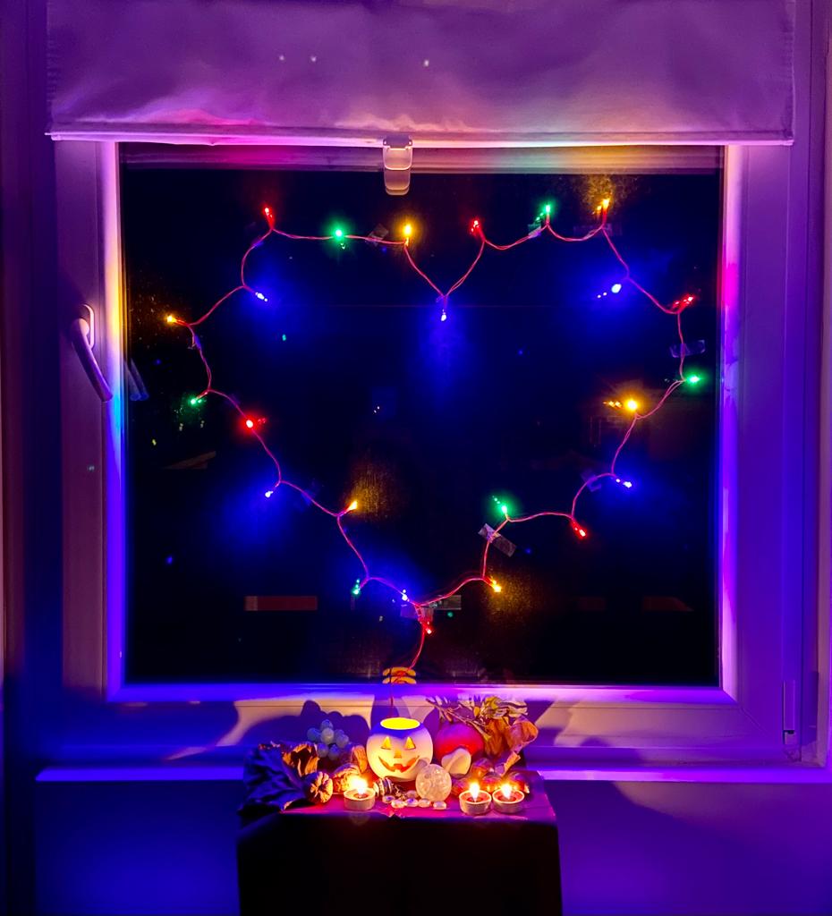 Metto luci a formare cuori alla finestra per varcare con amore le soglie dei mondi, mi sento intera, in spirito e materia, e felice correndo passo dopo passo a ritmo del mio cuore,