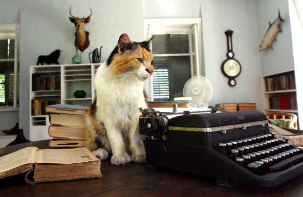 Thomas Hudson, uno dei protagonisti del suo romanzo: “Isole nella Corrente”, fu descritto proprio attraverso il rapporto col gatto: “Aveva il gatto allungato sul petto e tirò una leggera coperta su tutti e due e aprì e lesse le lettere e bevve a piccoli sorsi un bicchiere di whisky annacquato che tra un sorso e l’altro rimetteva per terra…Il gatto faceva le fusa, ma lui non lo sentiva perché le fusa del gatto erano mute, e allora lui teneva una lettera in mano e toccava la gola del gatto con un dito dell’altra.”