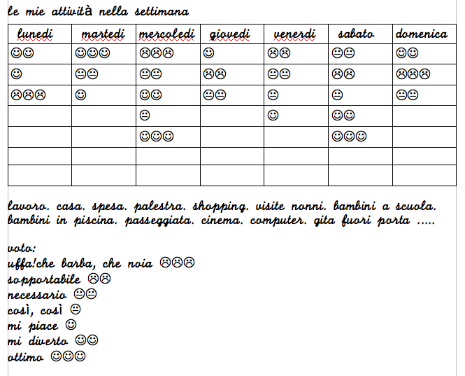 Fai uno schema della tua settimana tipo, annota tutte le tue attività, come sono distribuite nelle giornate della settimana. Ecco un esempio: