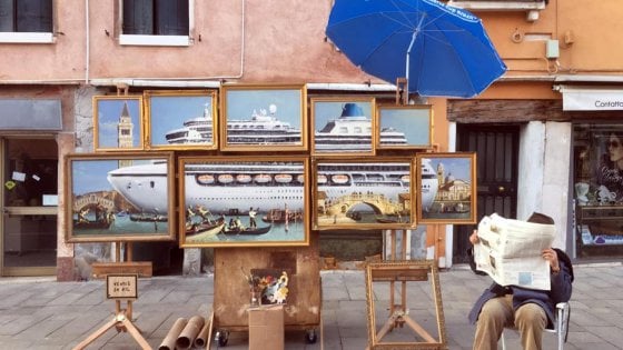 Nel maggio 2019 alla vigilia della Biennale d’Arte di Venezia due solerti vigili urbani esortavano un singolare artista a raccogliere i suoi cavalletti ed allontanarsi da piazza San Marco. Il soggetto di una serie di quadri era uno scorcio del Canal Grande solcato da un enorme nave da crociera a deturpare il fascino di una città unica al mondo e patrimonio dell’Unesco.