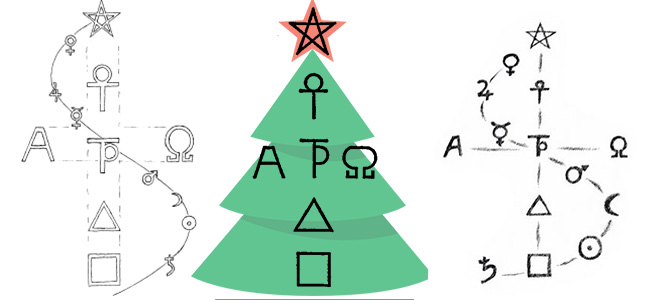 Il simbolo dell’albero di Natale è polare rispetto al simbolo della Natività del presepe, in quanto l’Albero rappresenta il primo Adamo, mentre la Natività il secondo Adamo venuto per redimere la caduta del primo. Nel corso delle epoche di cultura successiva all’antica egizia si è perso il significato dell’insieme dei simboli, tanto che i simboli dei pianeti sarebbero stati sostituiti prima dalle mele dell’Albero della Conoscenza, e poi dalle palline natalizie che rappresenterebbero così le sfere celesti.