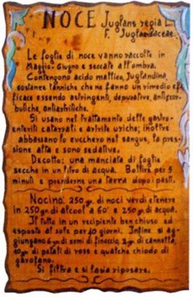 “Il nocino è un liquore da farsi verso la metà di giugno, quando le noci non sono ancora giunte alla maturazione. *Noci (col mallo) n. 30; spirito, litri uno e mezzo; zucchero in polvere, grammi 750; cannella regina tritata grammi 2; chiodi di garofano interi 10 di numero; acqua decilitri 1; la corteccia di un limone di giardino a pezzetti.* Tagliate le noci in quattro spicchi e mettetele in infusione con i suddetti ingredienti in una damigiana od un fiasco della capacità di quattro o cinque litri. *Chiudetelo bene e tenetelo per quaranta giorni in luogo caldo scuotendo a quando a quando il vaso. *Colatelo da un pannolino e poi, per averlo ben chiaro, passatelo per cotone o per carta, ma qualche giorno prima assaggiatelo, perché se vi paresse troppo spiritoso potete aggiungervi un bicchier d’acqua”.